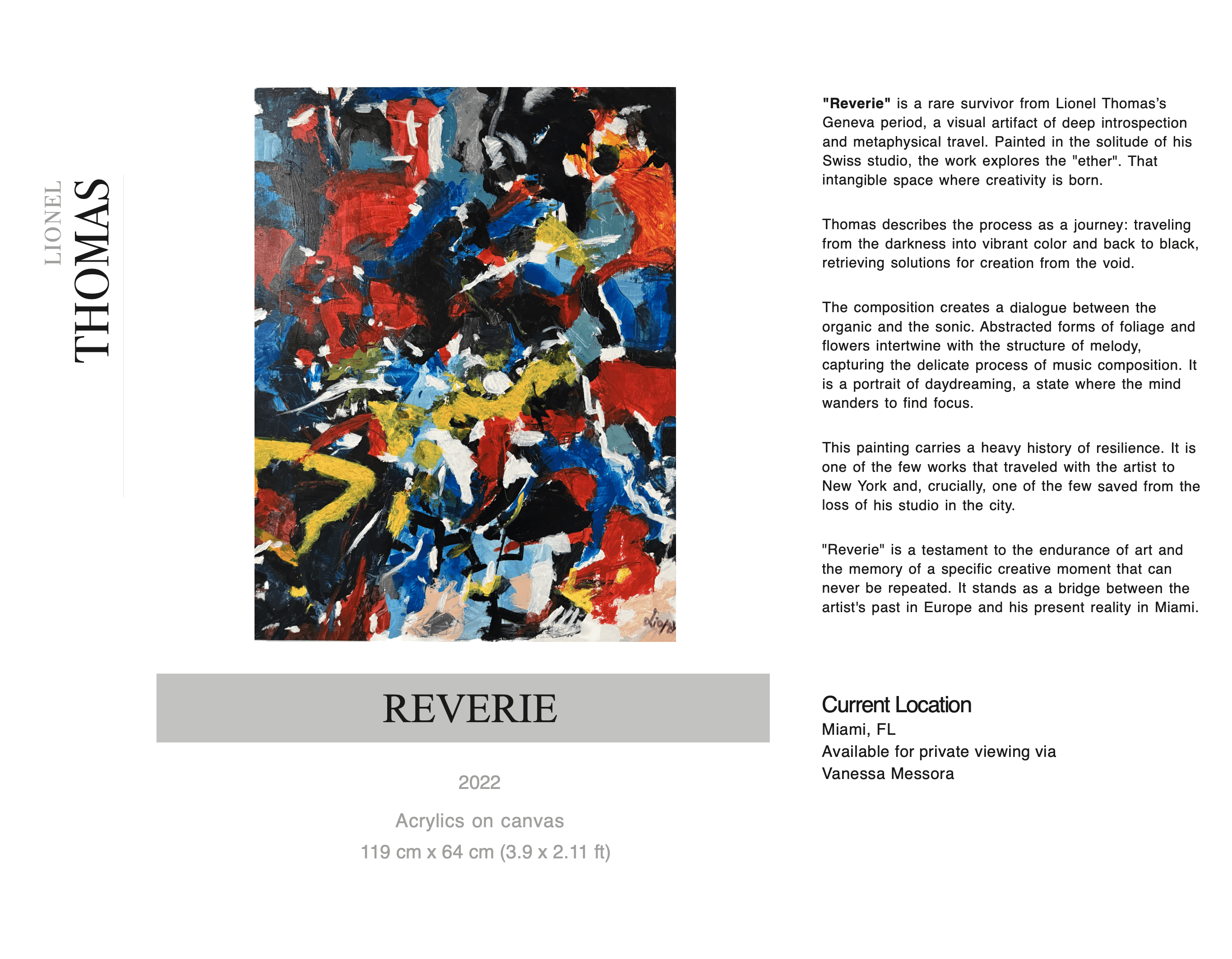 A rare artifact of survival. Painted in the solitude of Geneva and carried across the Atlantic, 'Reverie' is one of the few works to withstand the loss of Thomas’s New York studio. It serves as a visual bridge between European roots and the Miami empire. The composition intertwines organic forms with melodic structure, foliage, and sound waves clashing in an introspective dialogue. This work stands as a testament to resilience, a tangible piece of history that refused to be left behind.